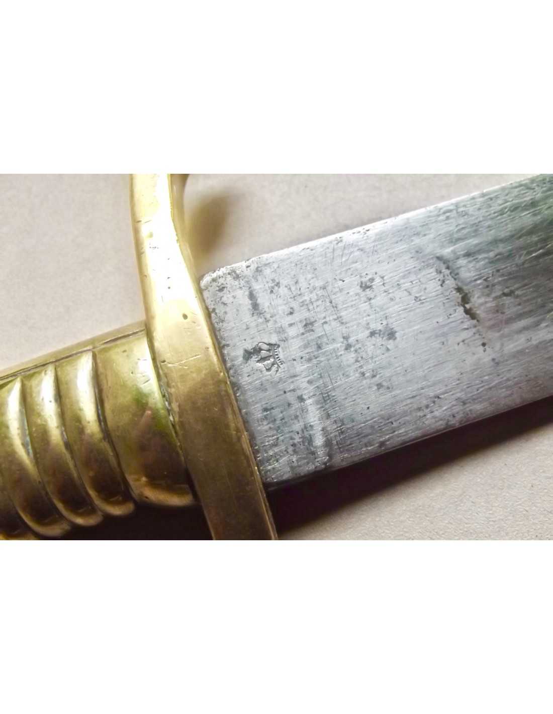 La lame de 47.7 cm est à un tranchant, dos plat. Poinçon à la couronne fermée au talon, aucun autre marquage. Fil légèrement irrégulier, marques d'affutage.