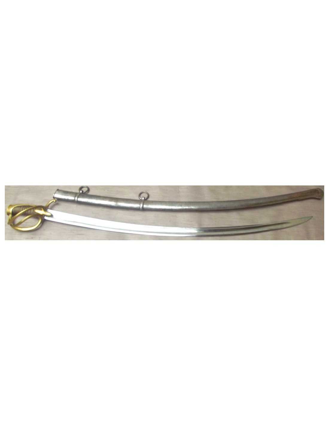 Ce modèle de sabre est né en 1800 sous la dénomination d’An IX avec un fourreau trop léger. En l’an XI le fourreau fut modifié avec l’emploi d’une tôle de fer plus épaisse. Il allait servir brillamment entre les mains notamment des Hussards et des Chasseurs à cheval durant les guerres napoléoniennes. Cet exemplaire a été fait sous la Restauration, peut-être pour la Garde Nationale à cheval.
