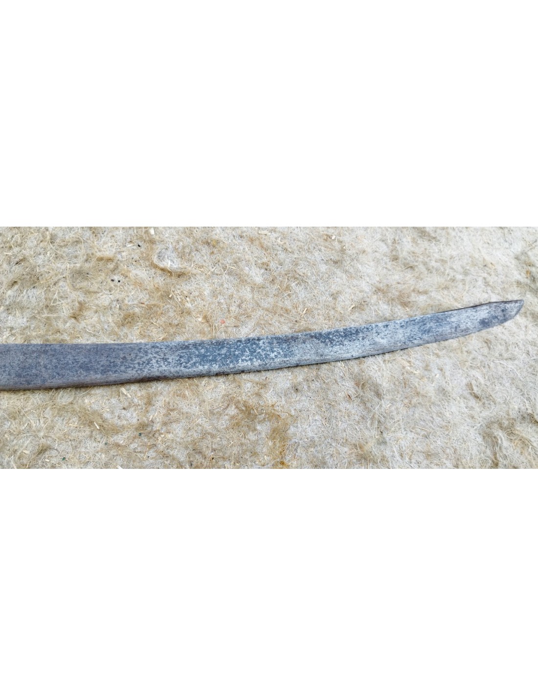 La lame de 55 cm est courbe et plate, elle est dans une patine grise, pailles de forge et restes d’une ancienne oxydation superficielle. Très légère torsion, peu visible, pointe légèrement retaillée.