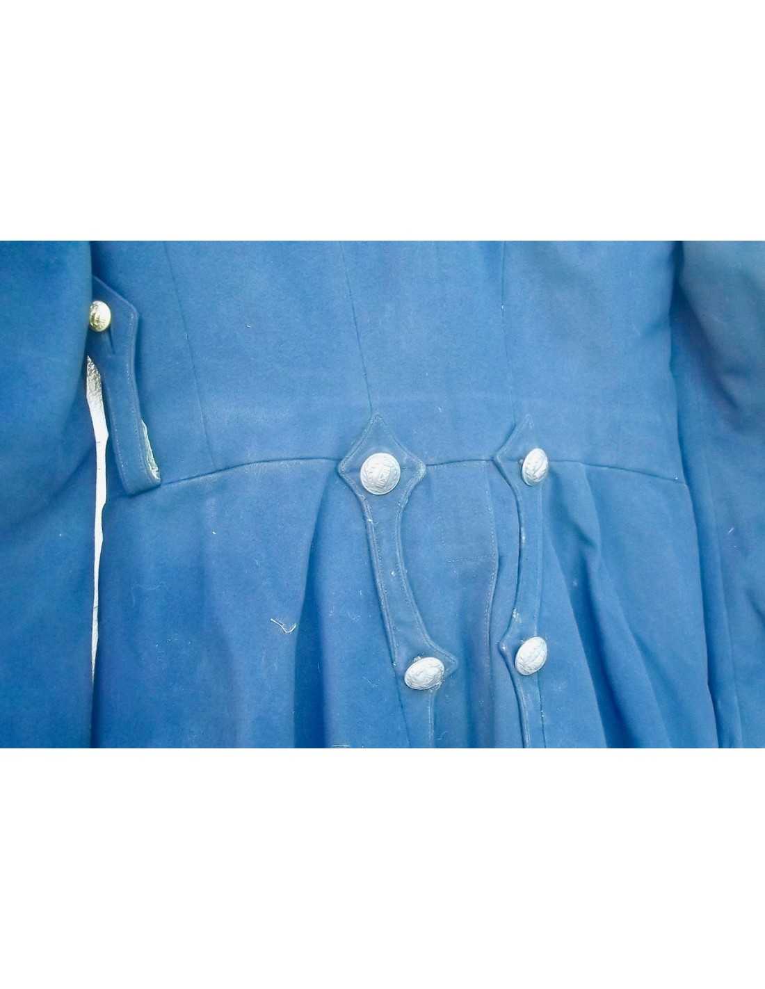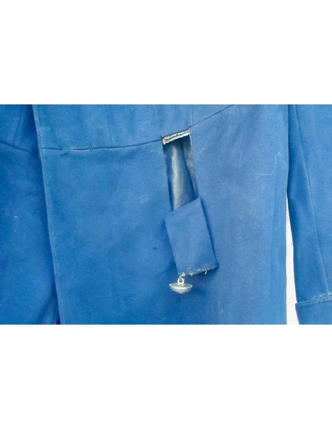En drap bleu sombre, col en velours grenat de belle facture.