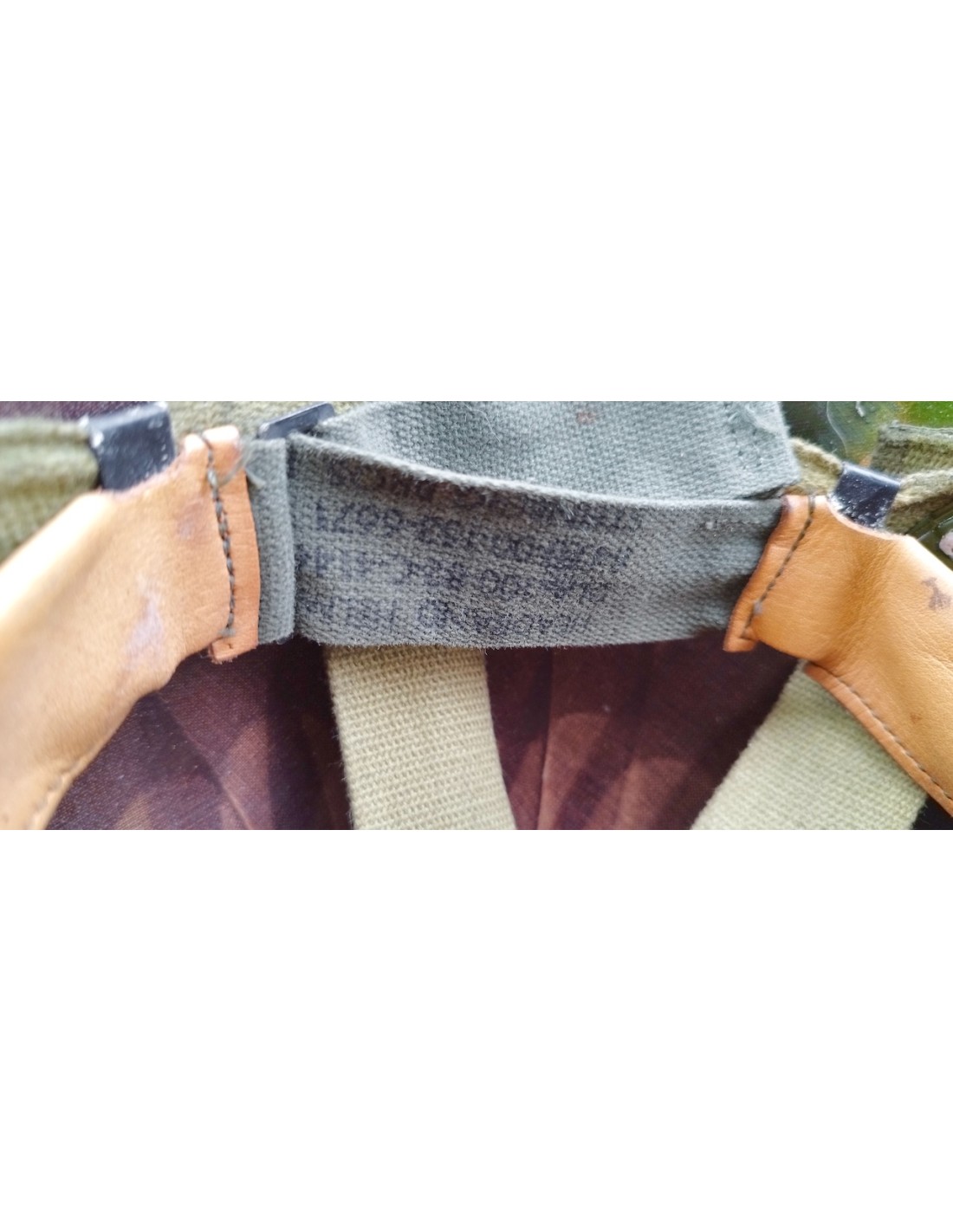 Coiffe intérieure en nylon kaki et bandeau cuir, fixations typiques, avec sa jugulaire.